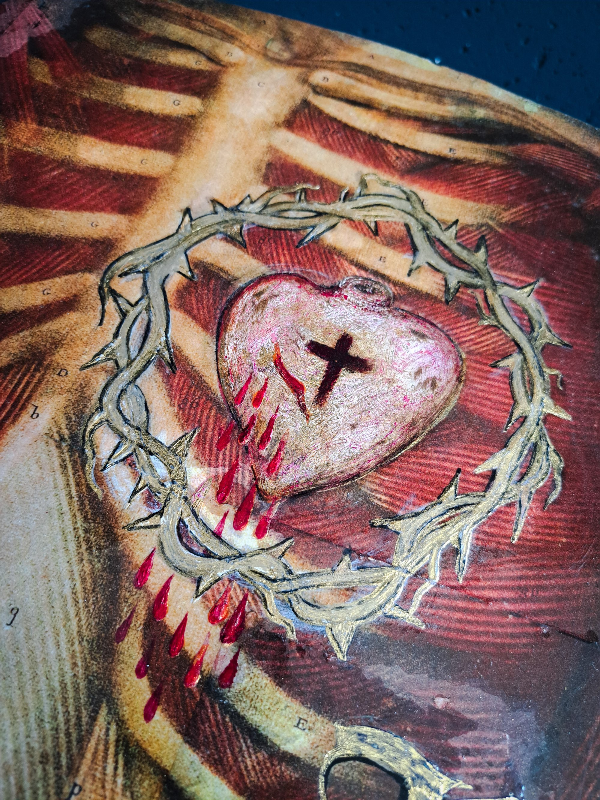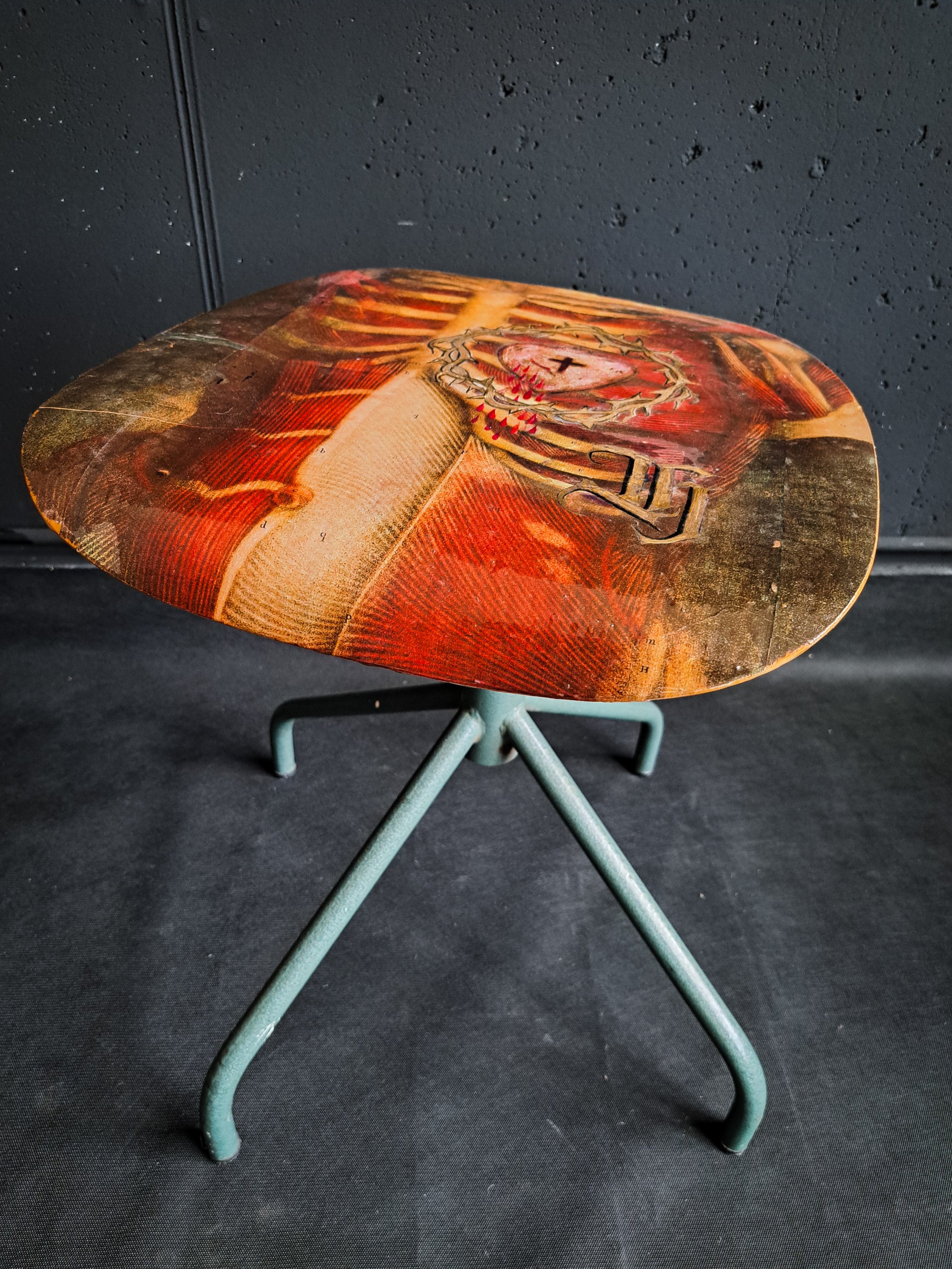 The stool thus becomes a small sculptural altar, an object that invites the viewer to contemplate the relationship between the sacred and the corporeal, a symbol of presence and reflection.
